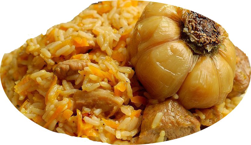 Time to Eat: Take apple slices and lay them on the plate first. Take a nice scoop of Plov and cover the apples and those who love garlic get a cluster!
