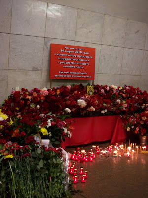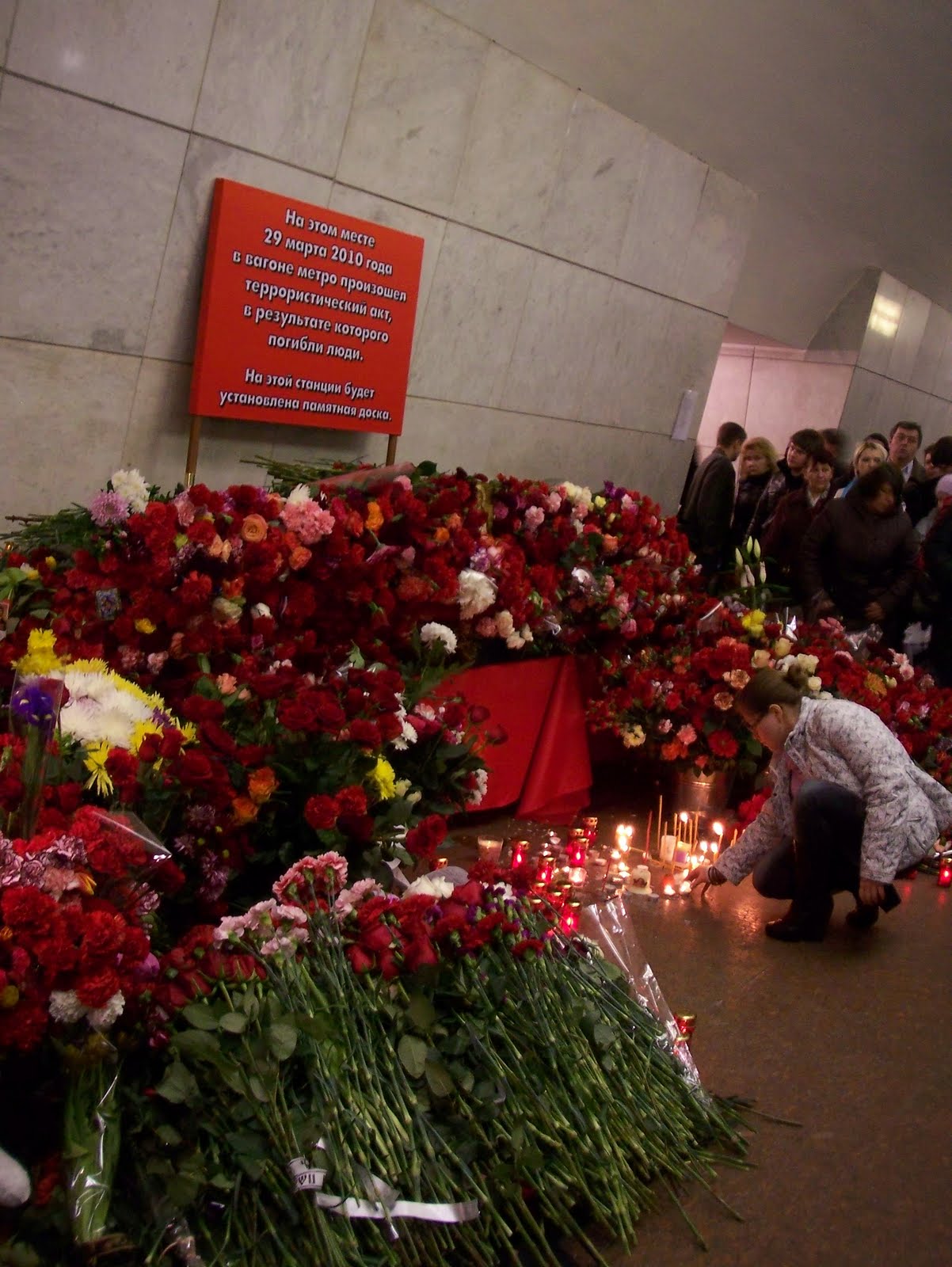 The sign reads: Here in this place March 29, 2010 terrorist attack was carried out in a subway car that killed people. At this station will be a memorial plaque.