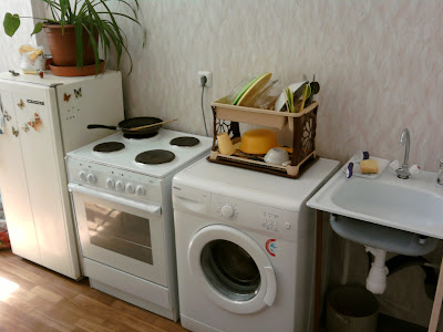 The refrigerator is from the Soviet era and belonged to Svetlana’s Aunt. (It is at least 30 plus years old.) The new stove came with the flat and we scrounged our rubles (9000 of them) and bought a new washer. Now the sink is standard equipment in a new flat. It is even by this country boys standards, terrible. We are going to live with it for now and to be honest, I am growing kinda fond of it. I have already cut some front leg braces for it and I am going to build a cabinet around it. I really think that I can make something of it. 🙂