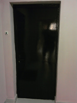 These pictures are of our new table that we built. It was made from the front door of flat (apartment) number 39 on the 8th floor. They tossed it out after replacing their door with a expensive fancy model. The last picture is our door after I have started to work on it. It no longer is it a clanging sounding door (insulation works wonders) and is solid as any steel door could be. I still have to get a gold number 2 to put on it as that is our flat – number 2.