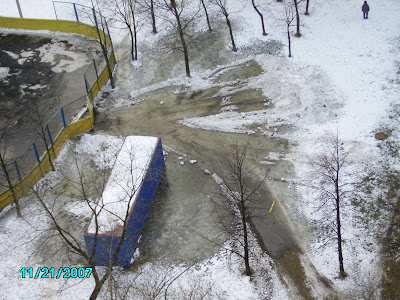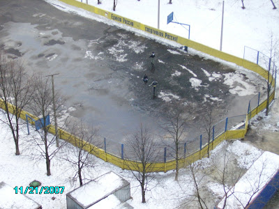 I took pictures from our flats balcony, To show you the new ice skating rink we have. The water on the outside is about a foot deep. It is frozen!!