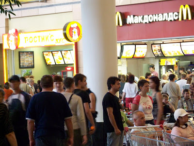 My wife took pictures with her new camera that we just bought her. (no one is safe any more) They are good pictures. It shows how Moscow, Russia people look. It shows the typical cigarette ads that are everywhere. It shows the volume of people that you find everywhere. It shows the two of the most favorite eating out places. It also shows the largest retail dealer in Russia.