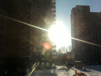 In Russia the sun does not like to get very high in the sky! Lets look at a picture of the sun at “High Noon!” (Or should we say “Low noon?”) This was taken today and I promise you that the sun is not very warm. This was the first real sight of the sun for what seems like two months. The sky is clear and that means real cold is coming! At the taking of this picture the thermometer was reading -21 degrees below zero Celsius. I hear rumors of -30 degrees below zero…